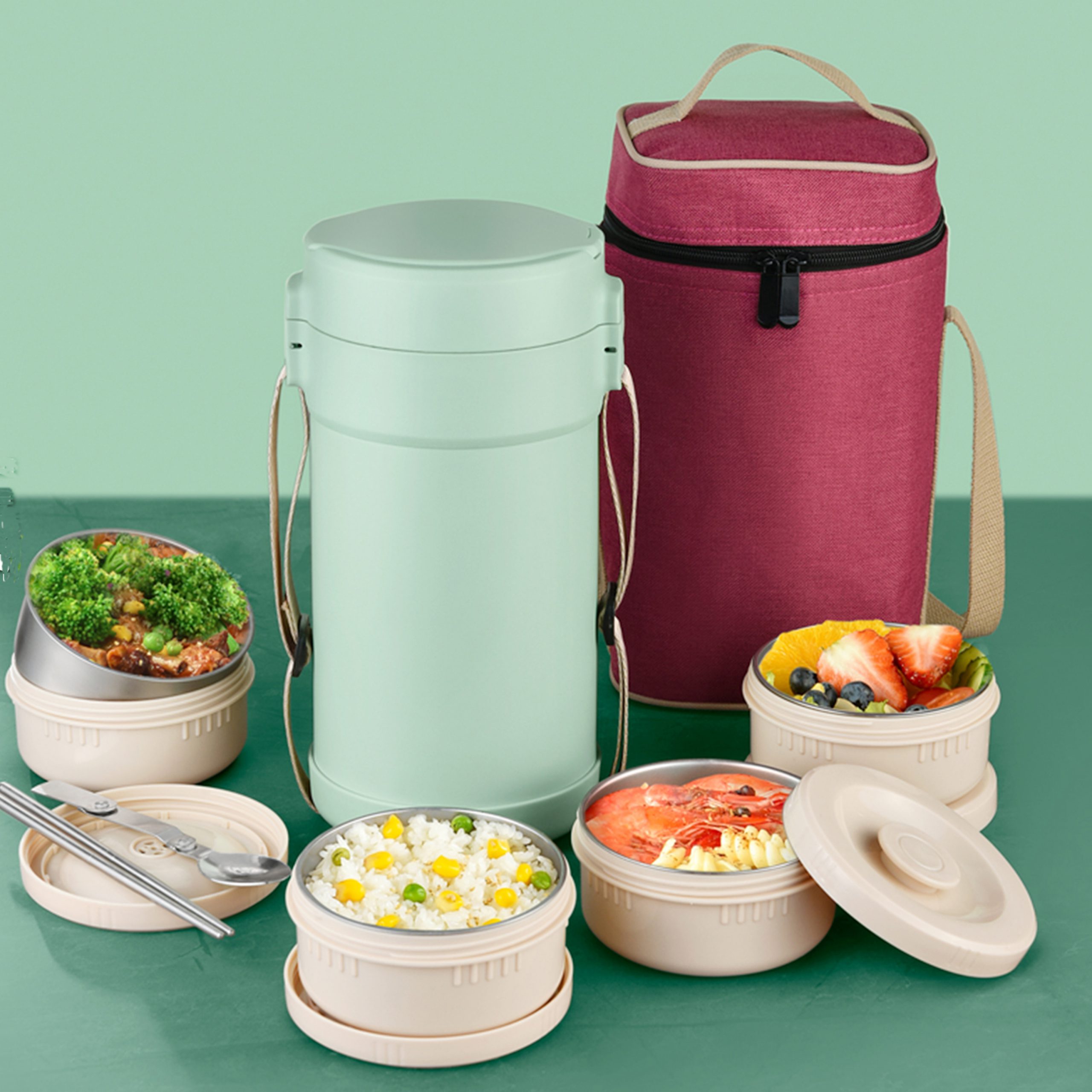 Produce Name: Hot Food Kids Lunch Box Set with Spoon Fork Tableware, Leak Proof Insulated (Green/Pink)
